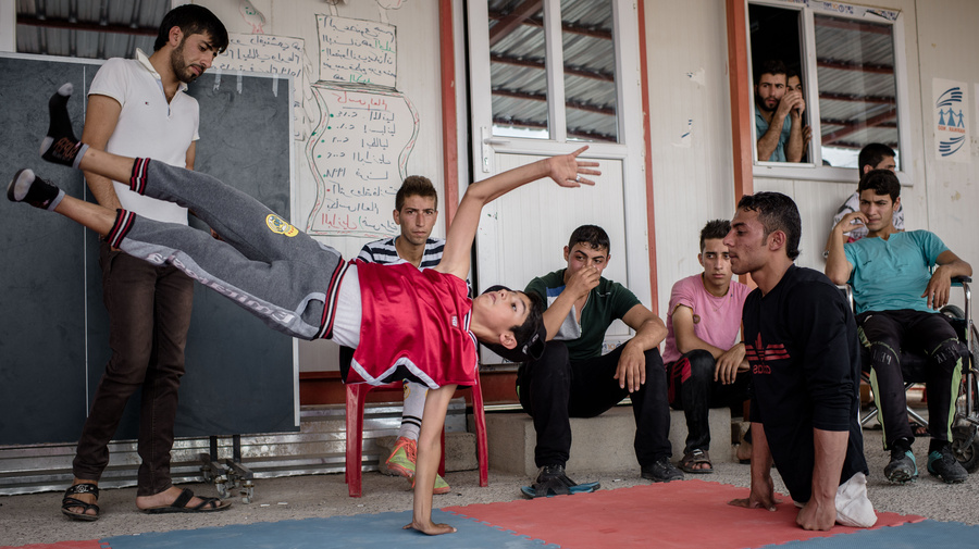 Dohouk, Iraq, 1er juin (HCR) - Par un après-midi chaud et ensoleillé au camp de réfugiés de Gawilan dans la région du Kurdistan d'Iraq, six jeunes garçons effectuent des rotations du corps sur la tête et des mouvements de jambes complexes au son trépidant de la musique breakdance.