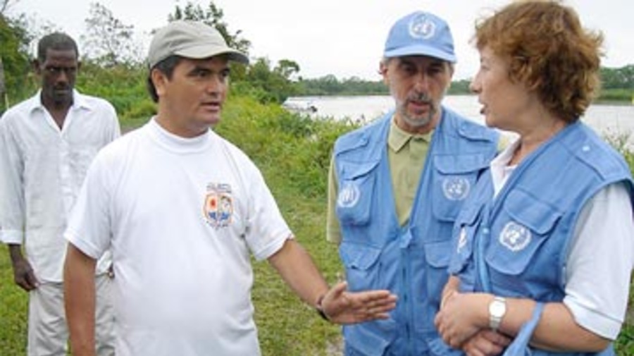Erika Feller (à droite), qui vient d'être nommée Haut Commissaire assistant pour la protection, rend visite aux communautés qui vivent près de la rivière et sont menacées de déplacement. En Colombie, plus de deux millions de personnes sont déplacées internes du fait du conflit armé.