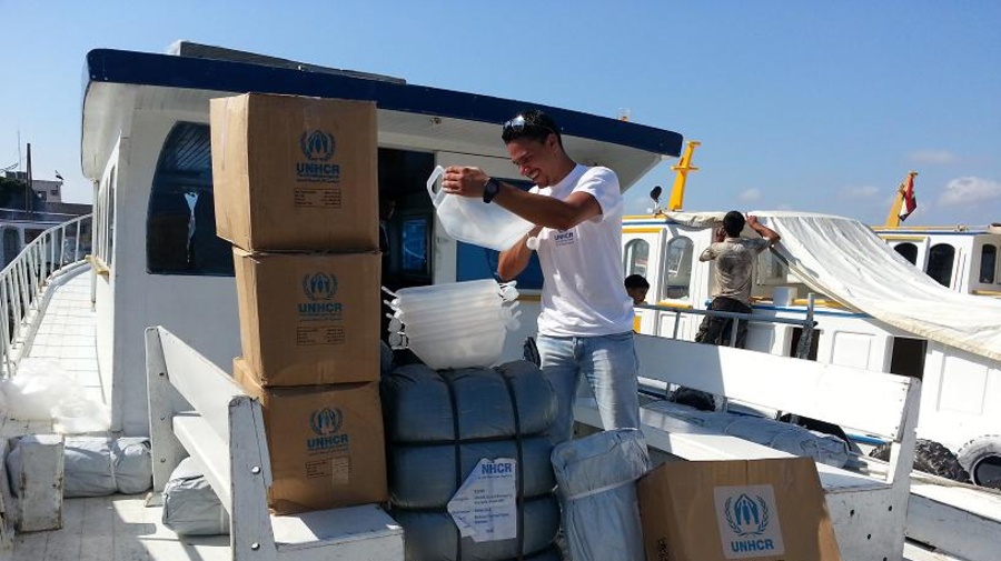 Un travailleur humanitaire vérifie le stock d'articles de secours sur l'un des bateaux qui ont acheminé le matériel du HCR vers l'île d'Arwad.