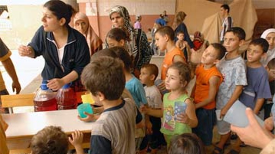 Distribution de boissons aux enfants dans une école à Beyrouth. L'UNHCR a commencé à aider les déplacés dans les zones montagneuses au nord de la capitale libanaise.