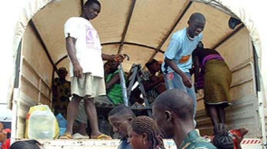 Des réfugiés sierra-léonais, chargeant leurs bagages au camp VOA de Monrovia, avant de rentrer chez eux en Sierra-Leone.