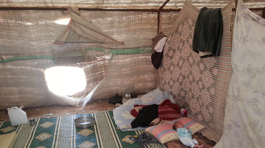 Un bébé fait la sieste dans l'une des tentes installées à Hasiya pour les familles syriennes déplacées. Les enfants connaissent de nombreux problèmes de santé là-bas.