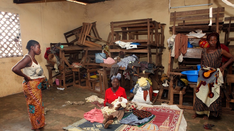 Le HCR demande davantage de financement pour venir en aide aux déplacés ivoiriens, comme ces femmes dans l'ouest du pays. Dans cette salle, elles ont mis les meubles de côté pour pouvoir disposer des matelas sur le sol.