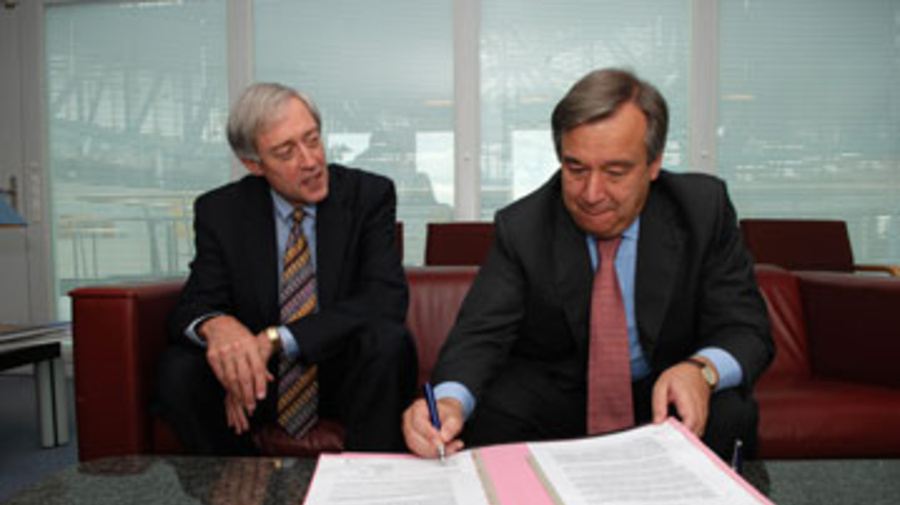 Le Haut Commissaire António Guterres signe un mémorandum d'accord avec George Rupp, Président du Comité international de secours.