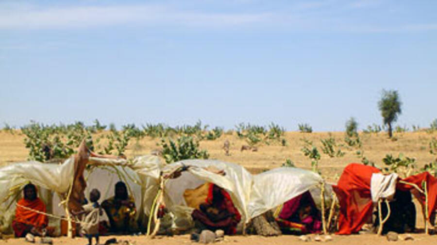 Certaines des 8 à 10 000 personnes rassemblées à Galu et Azaza à l'ouest du Darfour ont construit des abris de fortune pour se protéger du soleil, du vent ainsi que du froid durant la nuit.