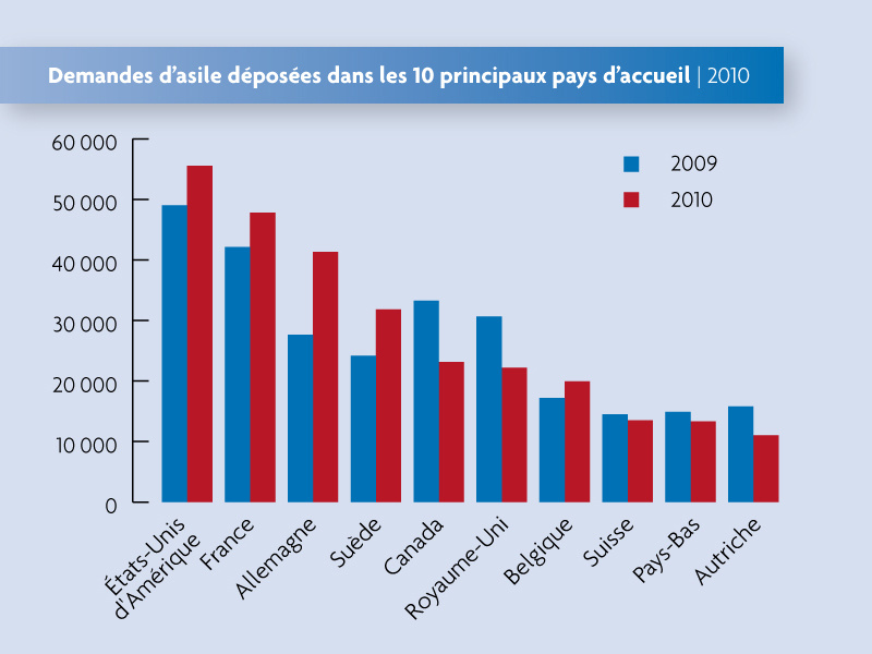 Les cinq premiers pays de destination des demandeurs d'asile en 2010 ont été : les Etats-Unis, la France, l'Allemagne, la Suède et le Canada. Ensemble, ces cinq premiers pays d'asile accueillent plus de la moitié (56 %) de la totalité des demandes d'asile comptabilisées dans ce rapport.