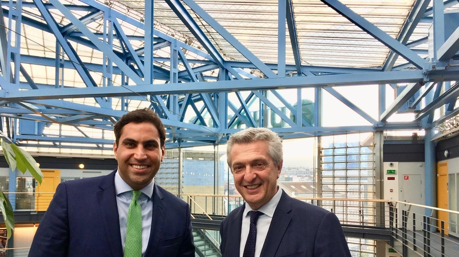 Ahmad Alhendawi, Secrétaire général de l'Organisation mondiale du mouvement scout, avec Filippo Grandi, Haut Commissaire des Nations Unies pour les réfugiés, au siège du HCR en 2019