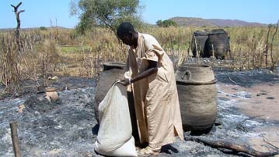 Avec la situation sécuritaire qui empire au Tchad, des milliers de personnes fuient leur foyer. Cet homme cherche des céréales dans les cendres de son habitation, dans un village à l'est du Tchad.