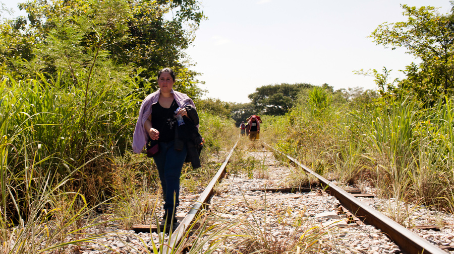 Une Salvadorienne marche le long d'une voie ferrée à Chiapas au Mexique, en octobre 2015.