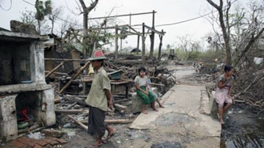 Des survivants du cyclône Nargis attendent de l'aide dans un village du Myanmar.