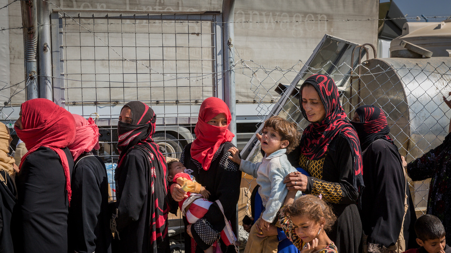 Des déplacées iraquiennes dans une file d'attente pour recevoir de l'eau et des vivres au camp de déplacés de Debaga, dans le gouvernorat d'Erbil en Iraq.