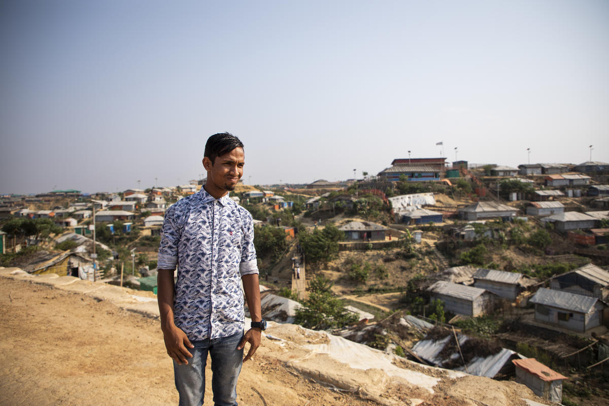 Mohammed Faisel, 23 ans, pose pour un portrait dans l'installation de réfugiés de Kutupalong au Bangladesh. En tant que réfugié rohingya du Myanmar, il dit profiter de chaque occasion pour parler avec les hommes de sa communauté de la nécessité de lutter contre la violence sexuelle et sexiste.