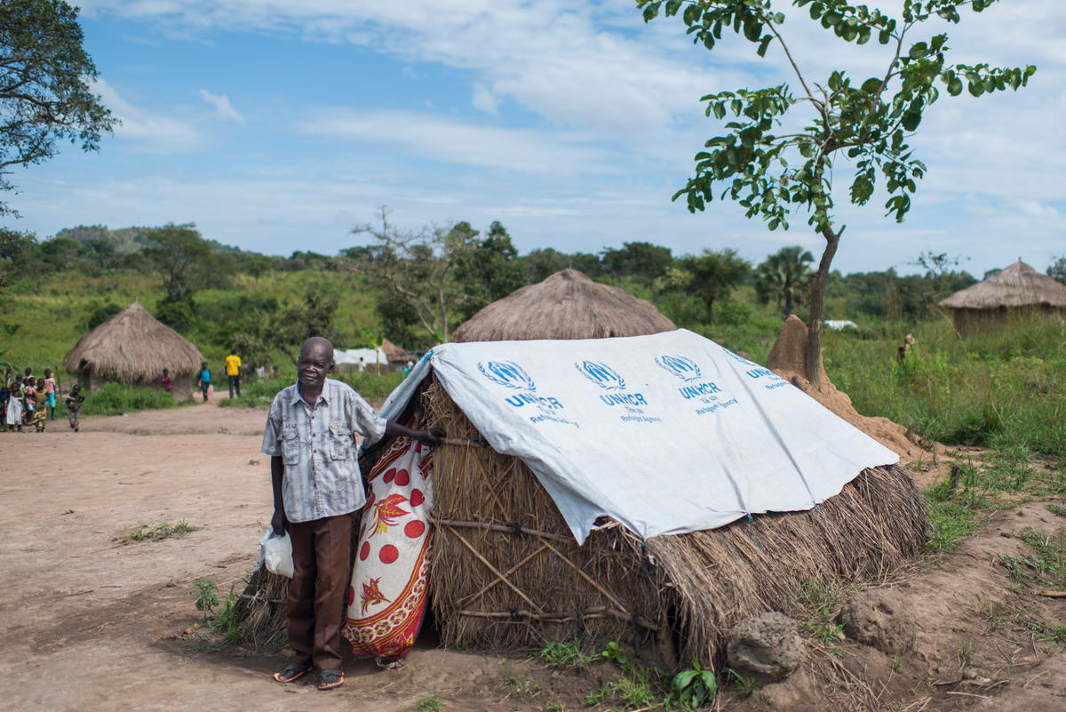 Peter, qui parle très bien l'anglais et travaillait autrefois pour l'administration locale au Soudan du Sud, s’extrait en rampant de son abri, une structure basse recouverte d'une bâche en plastique du HCR et dont la porte est faite d'un morceau de tissu.
