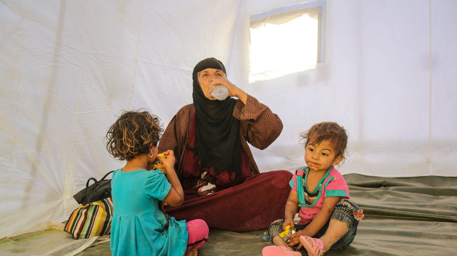 Une femme âgée avec deux enfants dans une tente au point de contrôle de Khazair. Ils n'ont pas d'argent et nulle part où aller. Les autorités et le HCR leur fournissent un abri, des kits d'hygiène et d'autres produits de première nécessité.