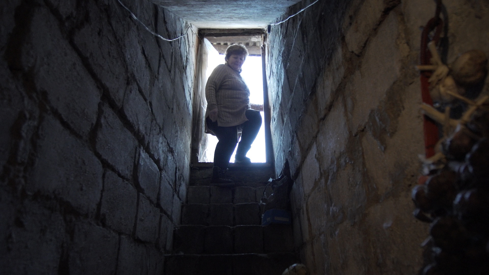 Dans la cour, une cave de garde a été aménagée. Cette pièce souterraine lugubre de quatre mètres carrés est très étroite lorsque les sept membres de la famille doivent s’y entasser. La famille a utilisé ce refuge pour se protéger des tirs d’artillerie, et elle y demeurera, devant un poêle artisanal, si la température chute radicalement.