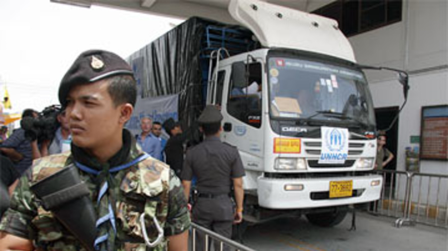 A Mae Sot samedi, un convoi de deux camions de l'UNHCR transportant plus de 20 tonnes de matériel d'urgence, a traversé lentement à 13h07 heure locale le pont « Friendship Bridge » marquant la frontière entre la Thaïlande et le Myanmar, après un bref arrêt administratif à la frontière. L'opération s'est déroulée sans accroc.