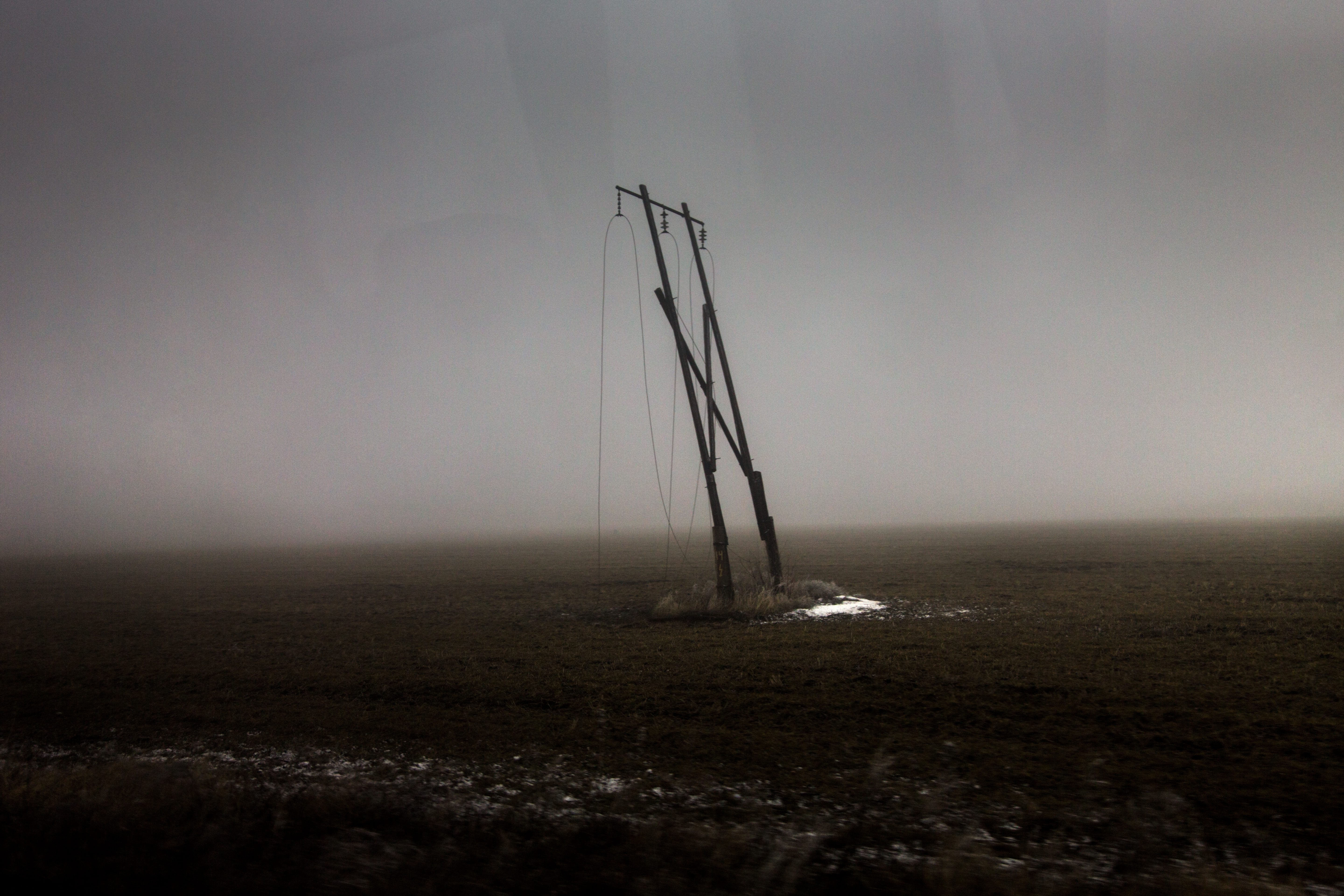 Comme un squelette de robot géant, dont les veines ont été tranchées et vidées de leur sang, le pylône électrique se dresse dans le brouillard de l'est de l'Ukraine. Il y en a plusieurs sur la route menant à Nikishino. Ils forment une sorte de garde d'honneur de la destruction, avec comme aboutissement une ville en état de désolation presque totale.