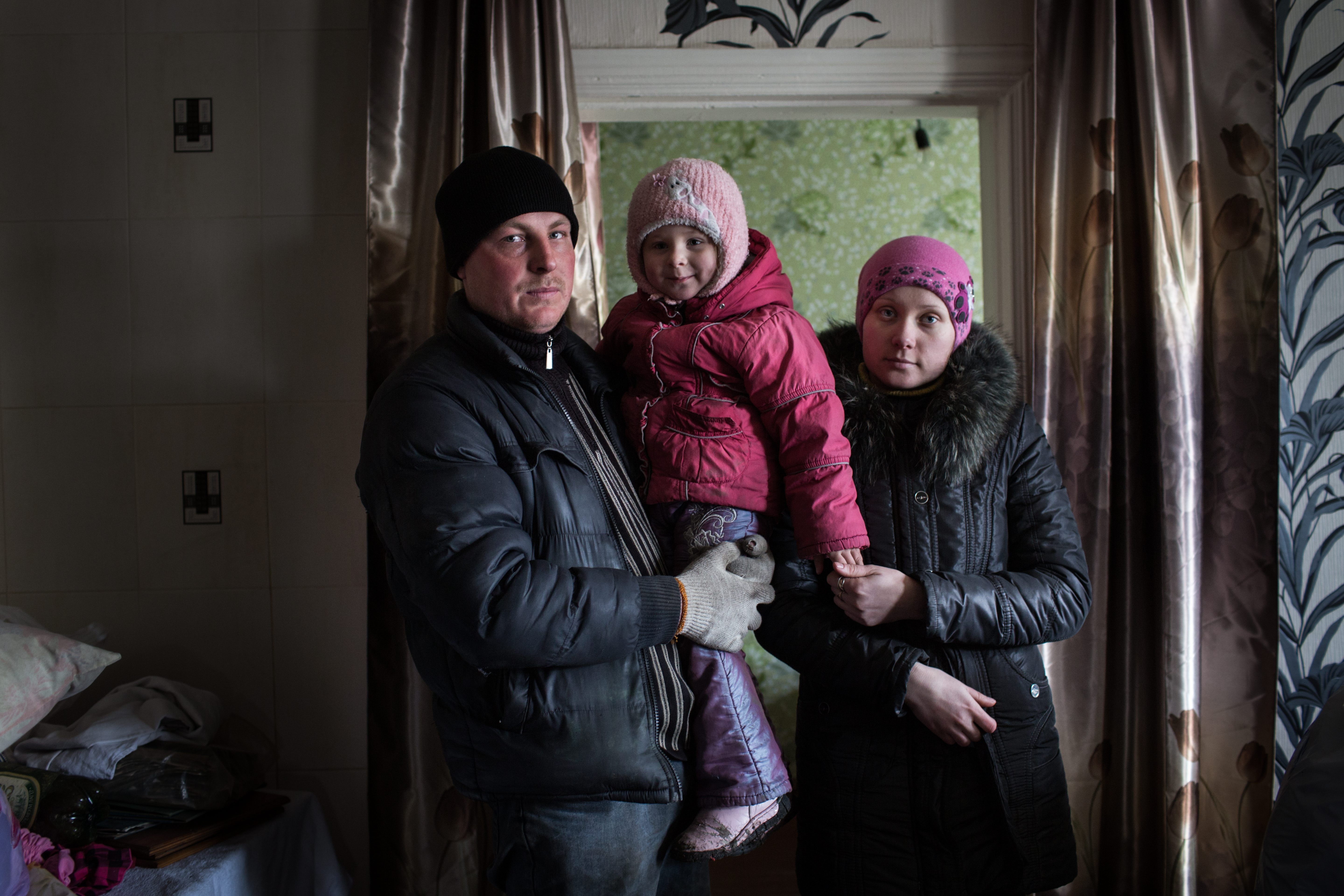 À côté, Sergueï, Katia et leur fille, âgée de trois ans, inspectent leur maison. Elle a été endommagée, puis saccagée pendant les combats. Ils ont déjà réparé une partie du toit. Sergueï et Katia ont tous les deux grandi ici; ils parlent de la rivière, de la beauté des lieux et de la pêche en été. Sergueï dit que dès l'arrivée du printemps, ils planteront le potager.