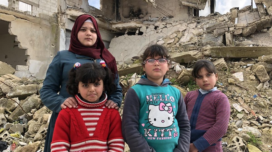 Zahida et ses filles, réfugiées syriennes de retour au pays, devant les ruines de leur maison à Souran, Syrie.