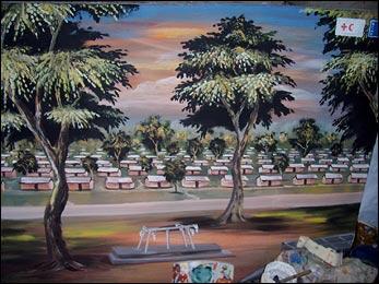 L'artiste peintre congolais Milus et les photos à partir desquelles il travaille au camp de réfugiés de Lugufu en Tanzanie. Ce réfugié avait déjà effectué le portrait du Président Mobutu Sese Seko, il peint maintenant des scènes de la vie quotidienne dans le camp.