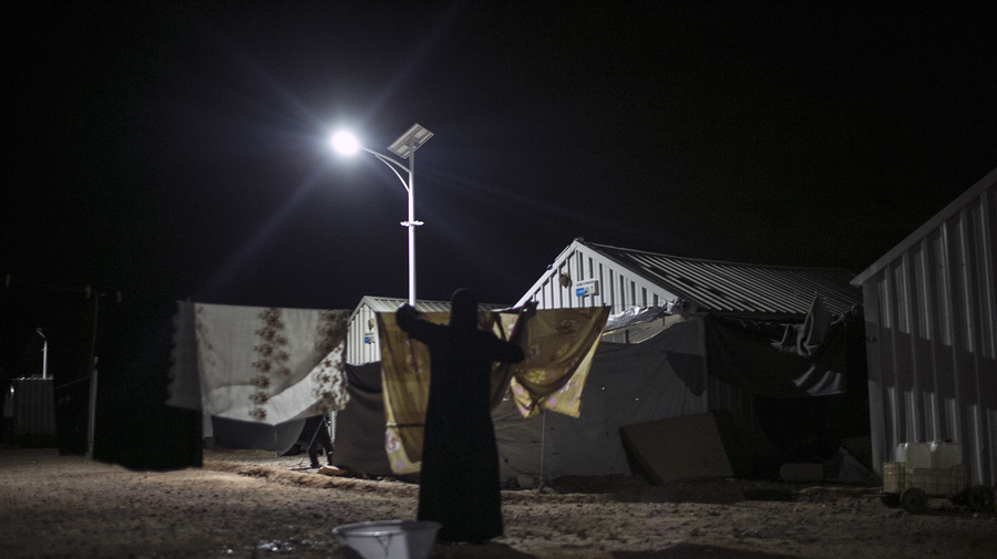 Une syrienne étend son linge à la lumière d'un réverbère solaire dans le camp de réfugiés d'Azraq en Jordanie.