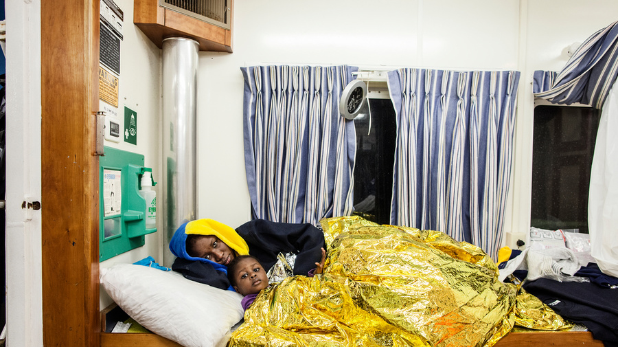 Yasmine, une femme enceinte âgée de 26 ans et originaire du Sénégal, se repose avec sa fille de deux ans, Khaija, dans la clinique à bord du Phoenix.