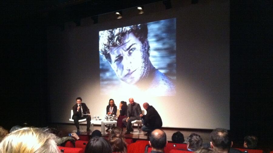 A Paris, le réalisateur Emanuele Crialese, l'actrice Timnit T. et le Représentant du HCR en France, Philippe Leclerc, débatent du film « Terraferma » lors de la soirée d'avant-première.