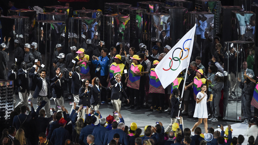 Rose Lokonyen porte le drapeau olympique à la tete de l'équipe des athlètes réfugiés durant la cérémonie d'ouverture des Jeux Olympiques de Rio2016.