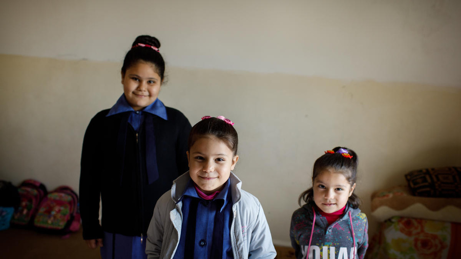 Les trois soeurs syriennes, Izdihar (gauche), 8 ans, Alimar (milieu), 6 ans, et Abeer (droite), 5 ans, sont en tête des élèves de leurs classes respectives.