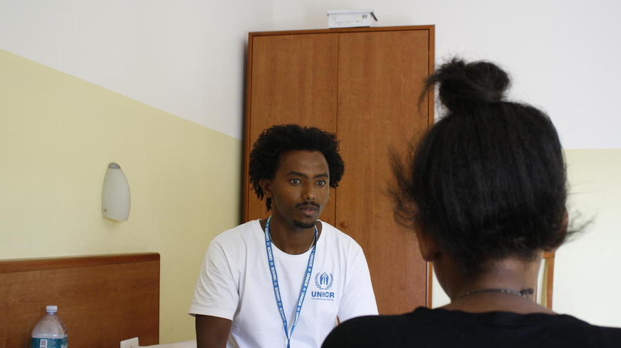 Kobob témoigne de son parcours à un employé du HCR dans un centre de réception pour jeunes filles non accompagnées à Pozzallo, Italie.