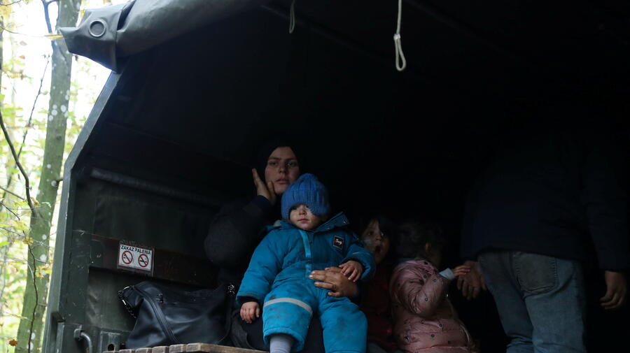 Une famille irakienne à bord d'un camion militaire à Hajnowka, en Pologne, après avoir traversé la frontière depuis le Bélarus, le 14 octobre 2021.