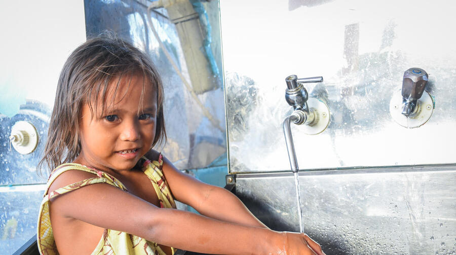 Une jeune réfugiée indigène warao du Venezuela se lave les mains, après une session éducative sur la prévention de la propagation du coronavirus et menée par le HCR ainsi qu'une ONG partenaire, Fraternidade, dans un centre d'hébergement à Boa Vista, dans le nord du Brésil.