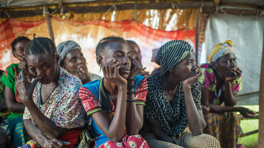 Faiza (au centre, en violet), 31 ans, est originaire du village de Manono dans la province du Tanganyika. Elle est assise parmi un groupe de femmes congolaises qui ont établi un site de déplacés internes à l'école primaire EP Moni à Kalemi.