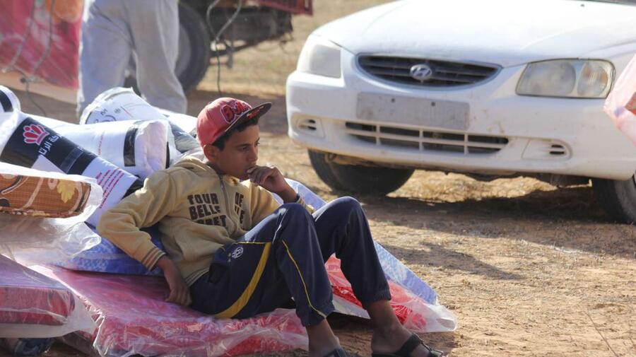 Un jeune déplacé interne libyen est assis sur un matelas distribué par le Croissant-Rouge à Alarbaïn, en Libye. Il fait partie des milliers d'habitants de Syrte qui ont été déplacés par les combats.