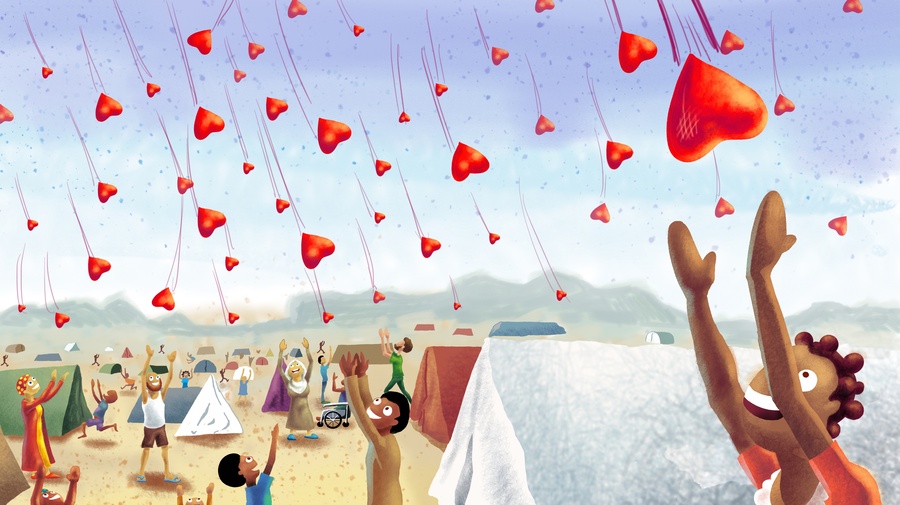 « Les réfugiés d'un camp sont impatients de recevoir un cœur qui symbolise l'amour.