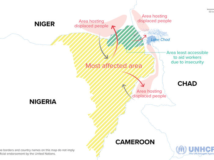 Le bassin du Lac Tchad est actuellement submergé par une complexe urgence humanitaire. Plus de 3,2 millions de personnes sont déracinées, dont plus de 2,9 million de déplacés internes dans le nord-est du Nigéria, plus de 778 000 déplacés internes au Cameroun, au Tchad et au Niger et 304 000 réfugiés dans les quatre pays.