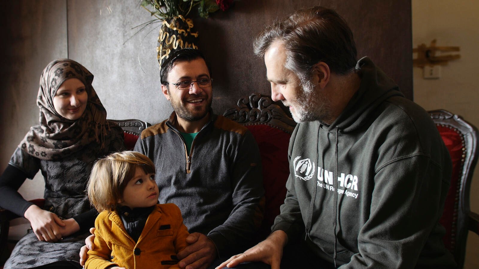 Considérés par le HCR comme une famille hautement vulnérable, Talal et Maha ont été identifiés pour la réinstallation. Après avoir passé les contrôles de sécurité du ministère de l'Intérieur du Royaume-Uni, ils ont été sélectionnés en vue de leur réinstallation dans le pays. Quelques mois après les avoir rencontrés au Moyen-Orient, David Morrissey leur a rendu visite dans leur nouvelle maison du nord-ouest de Londres où ils s'attachent à apprendre l'anglais ; leur fils Hisham est à la garderie.