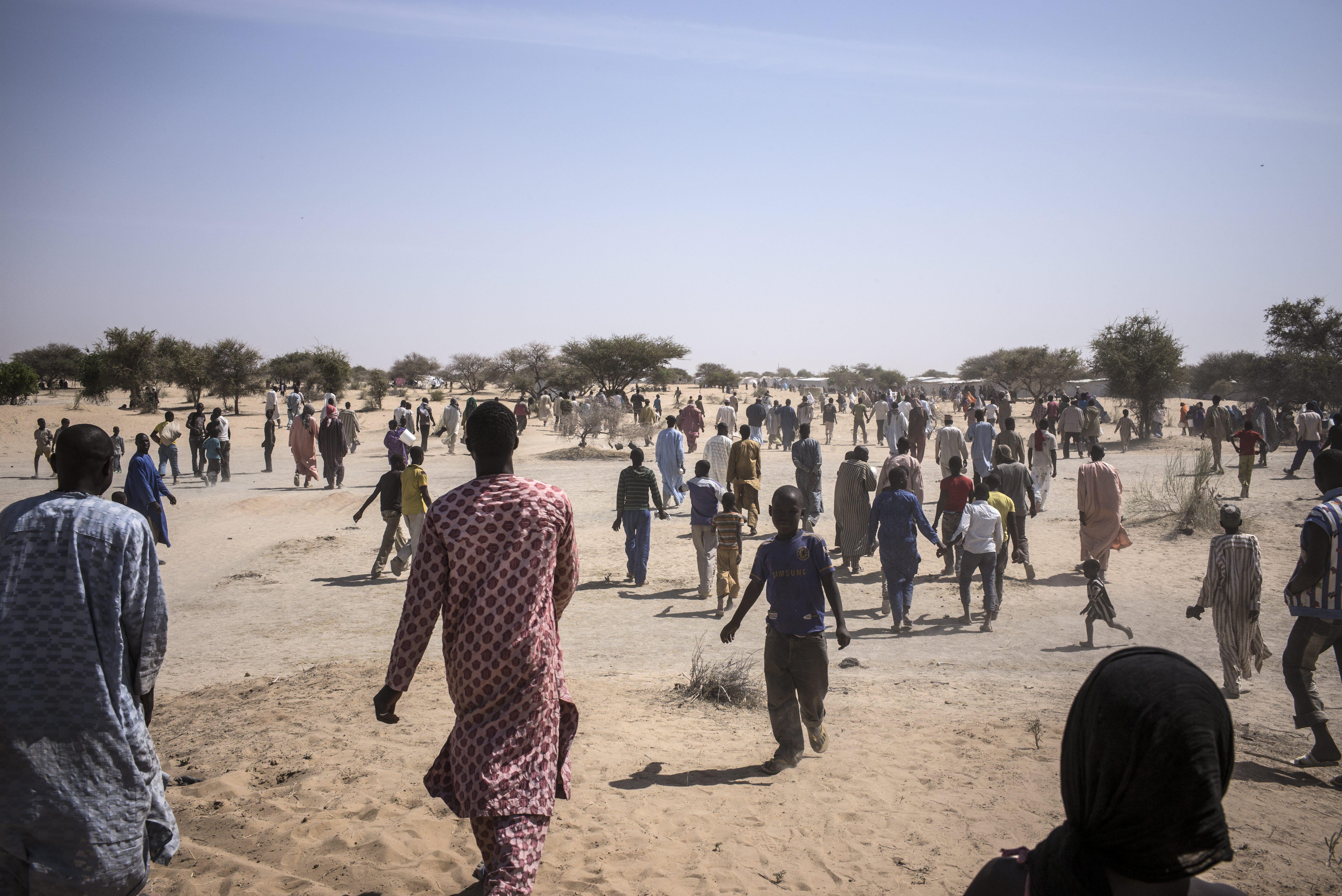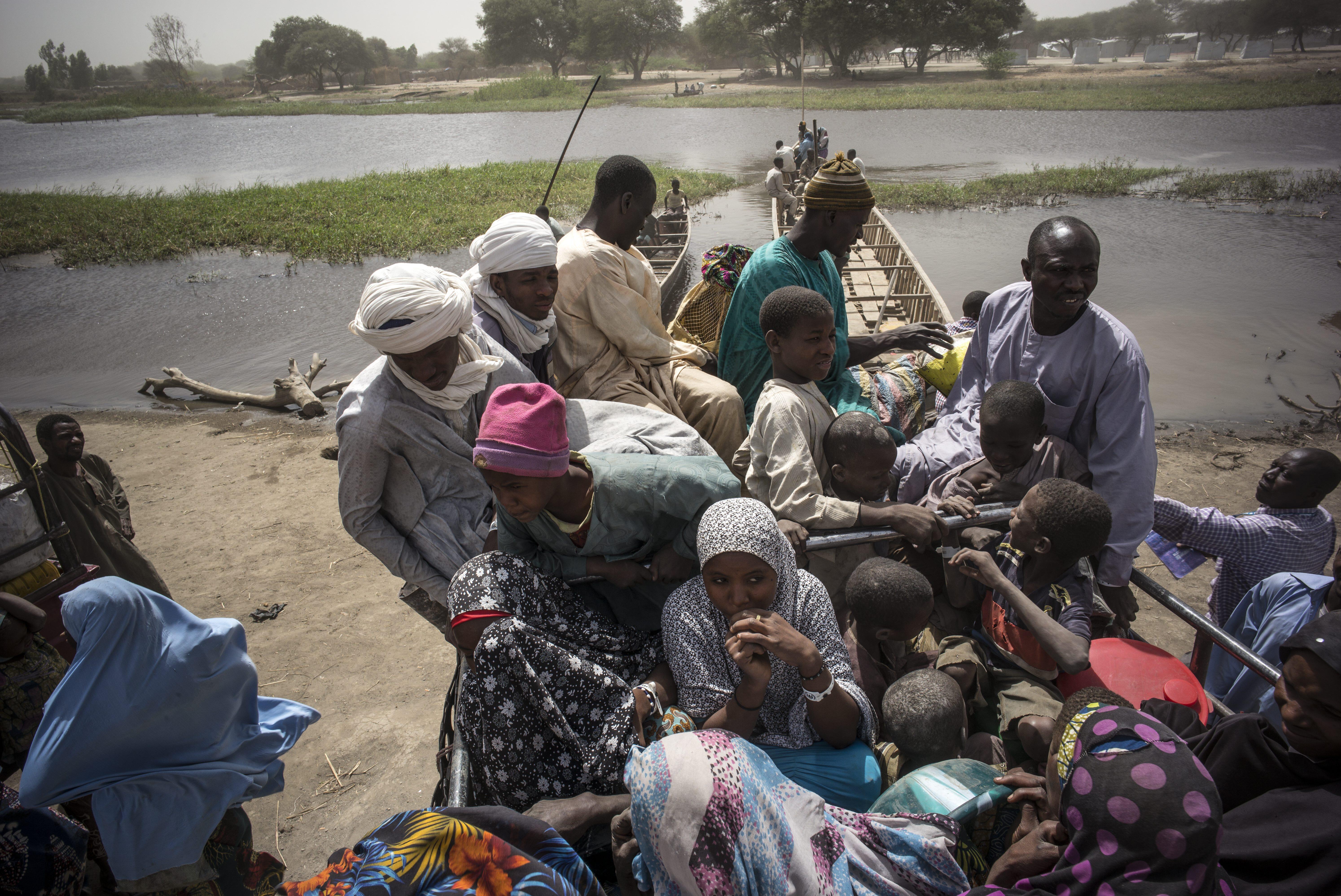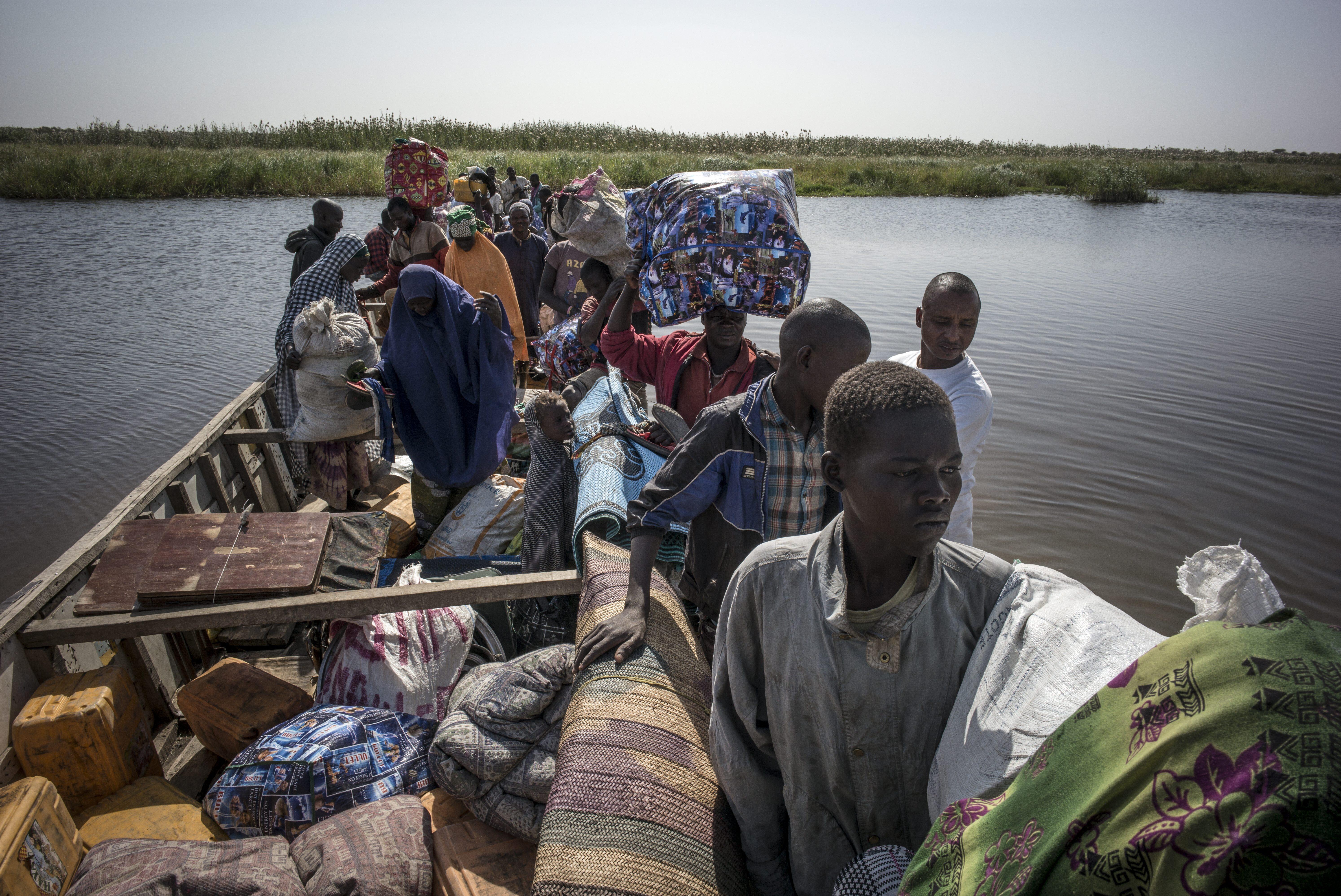 Des réfugiés nigérians se rendent de Ngouboua, leur lieu initial de refuge sur les rives du lac Tchad, vers le site de Dar-es-Salam, près de Baga Sola, au Tchad. Concentrer tous les réfugiés au même endroit est le seul moyen de leur porter assistance.