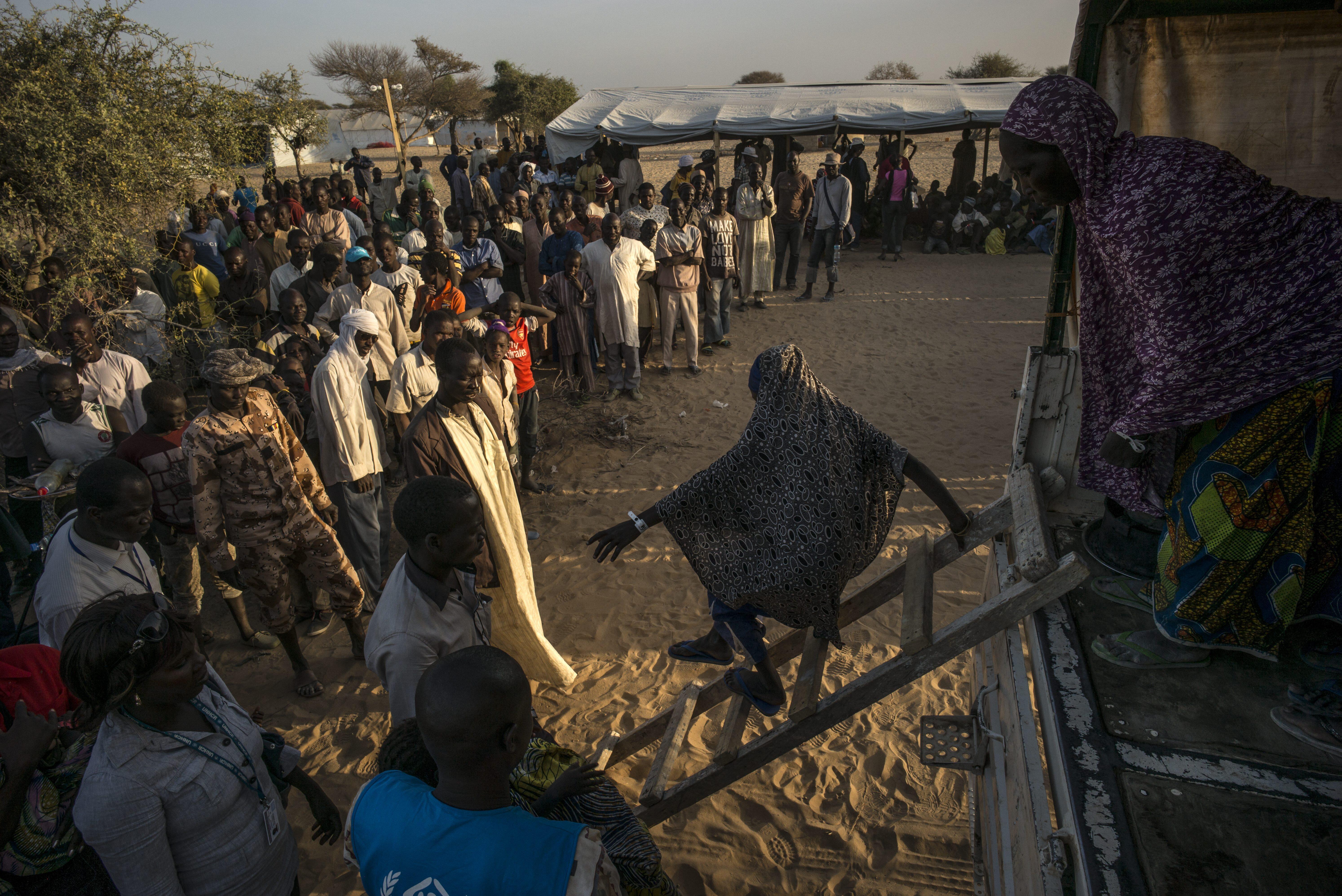 Des réfugiés nigérians débarquent du camion du HCR en arrivant dans le site de Dar-es-Salam, près de Baga Sola, au Tchad.