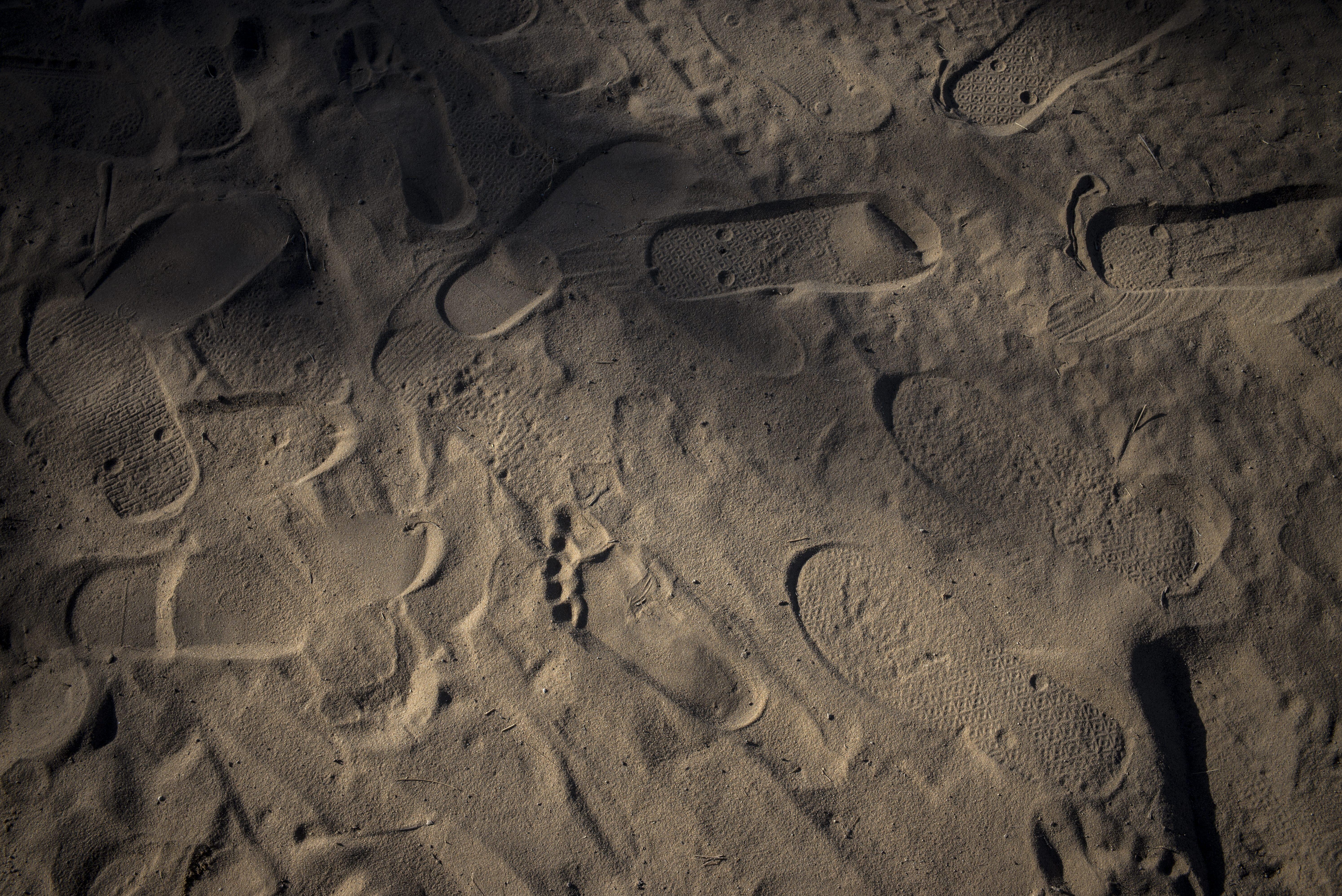 Empreintes de pieds laissées par des réfugiés nigérians et des travailleurs humanitaires dans le site de Dar-es-Salam, au Tchad.