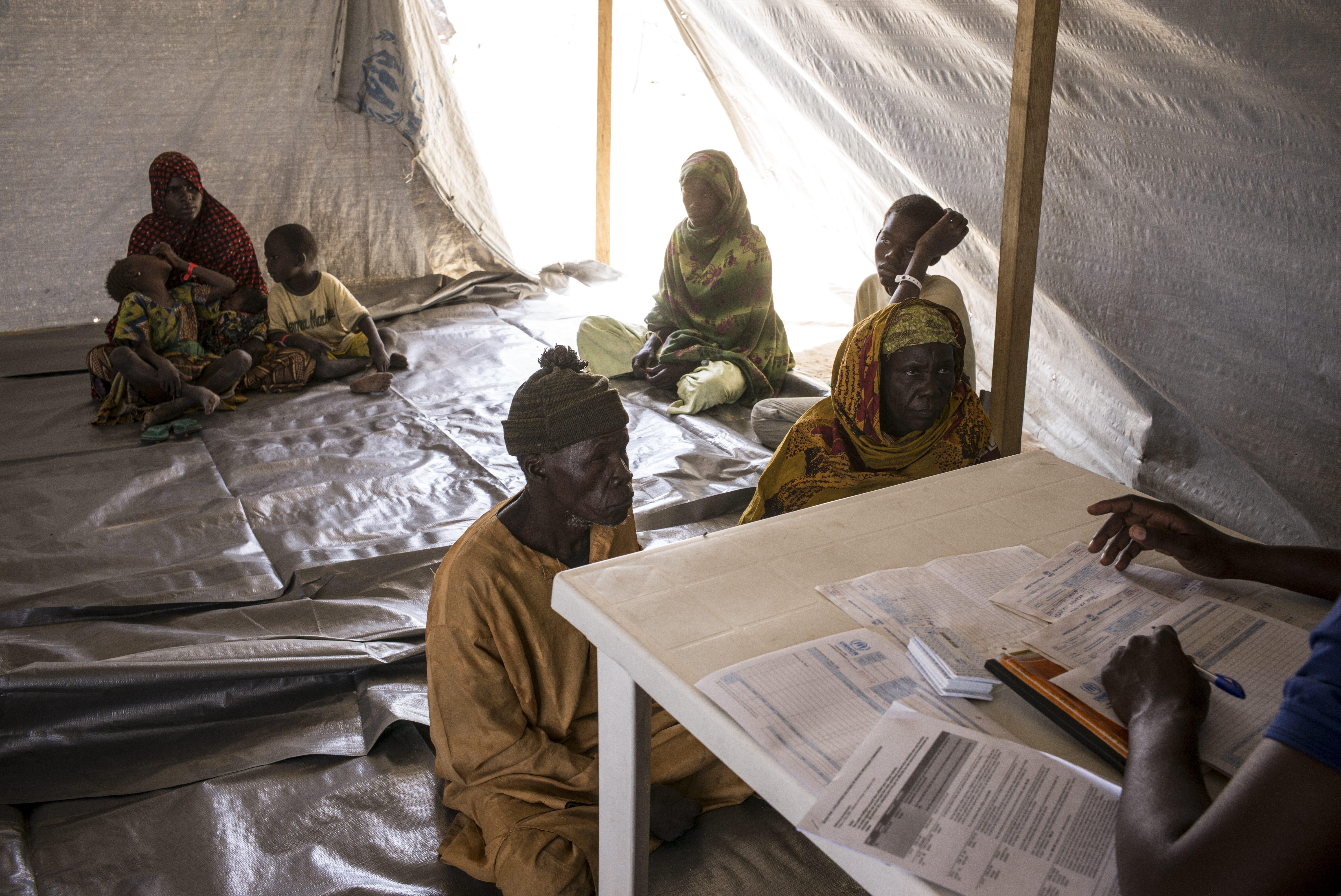 Moussa Gapchia et Falmata Mohamed enregistrent leur famille auprès du HCR dans le site de Dar-es-Salam, au Tchad. Ils sont arrivés la veille, après cinq semaines de fuite.