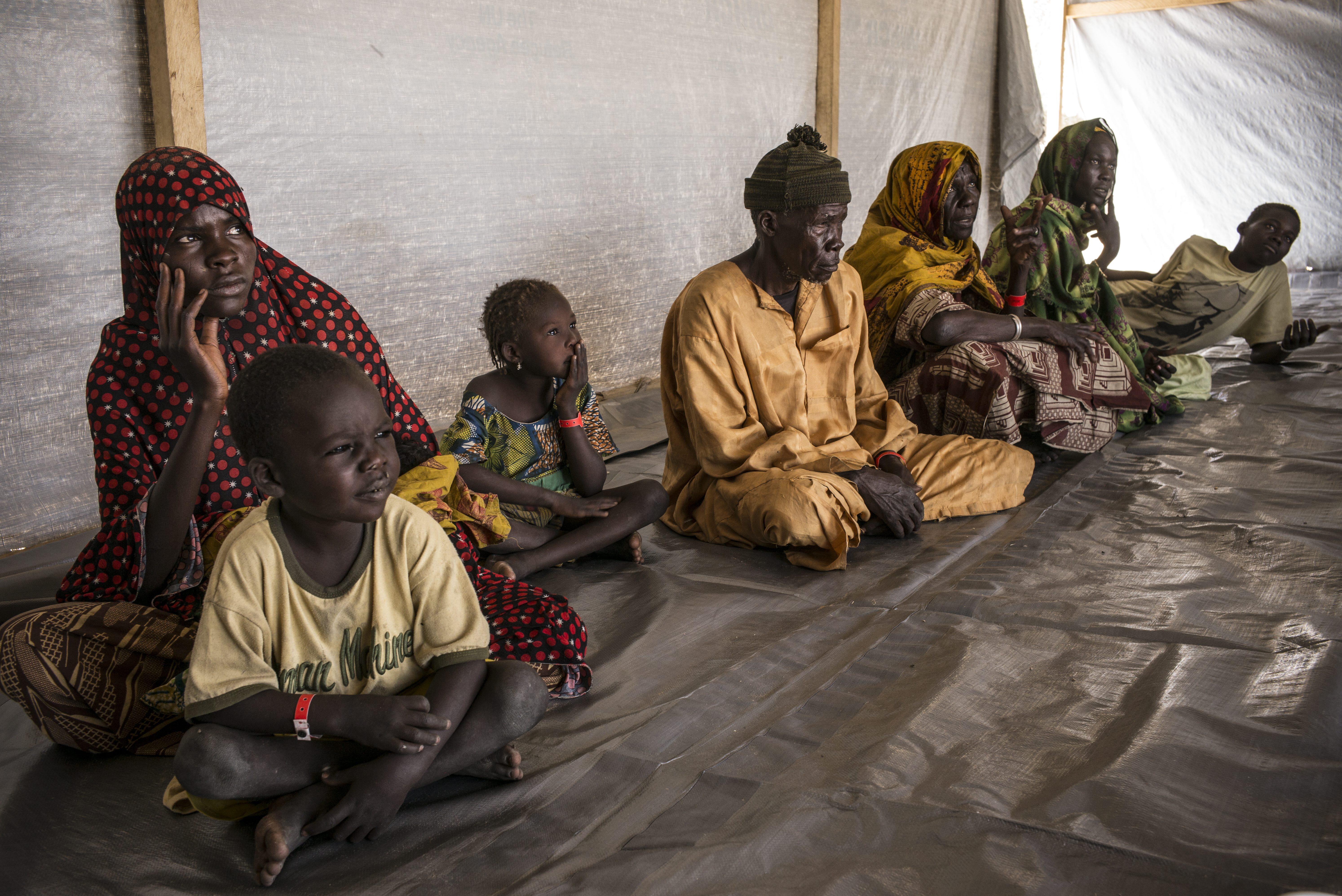 Kalthouma Abakar (à gauche), 22 ans, est assise avec ses trois enfants, ses parents, sa soeur et son neveu, Alhaji Haoudou, dans une tente du HCR où a lieu l'enregistrement, dans le site de Dar-es-Salam, au Tchad.