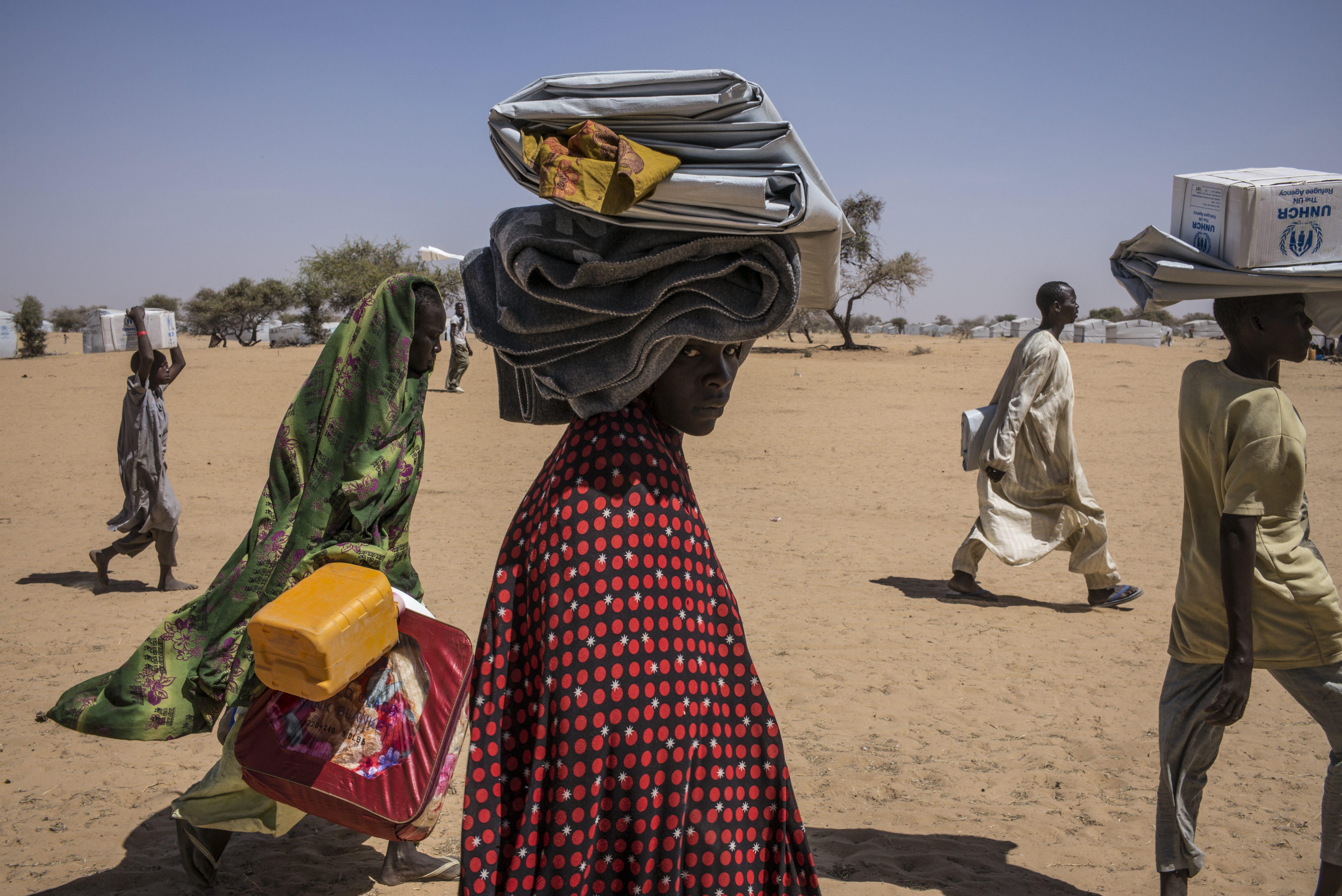 Kalthouma, 22 ans, et sa famille transportent les produits de secours fournis par le HCR vers leur nouvel abri dans le site de Dar-es-Salam, près du village de Baga Sola, au Tchad.