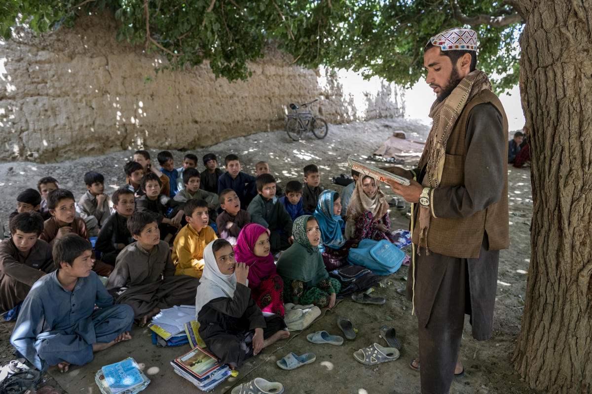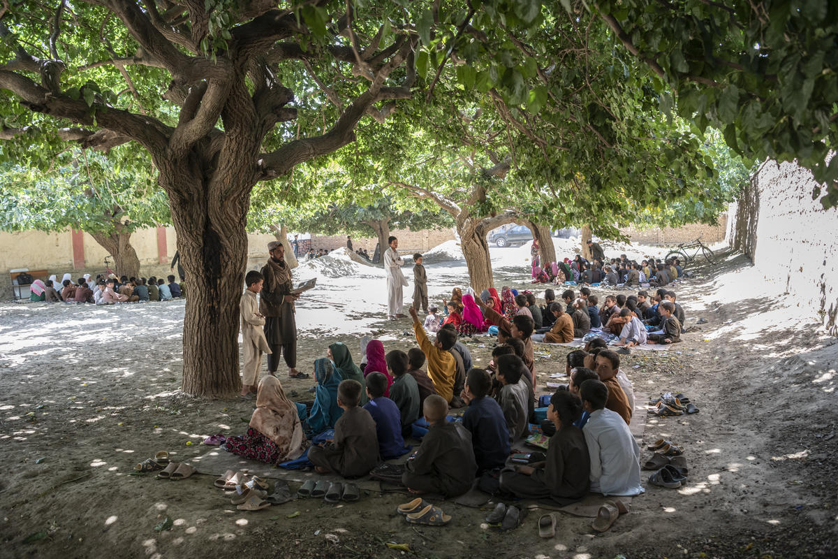 Mursal et ses camarades sont aujourd'hui installés sur un simple tapis à l'ombre d'un mûrier face à leur professeur qui passe en revue les tables de multiplication en pachtoun.