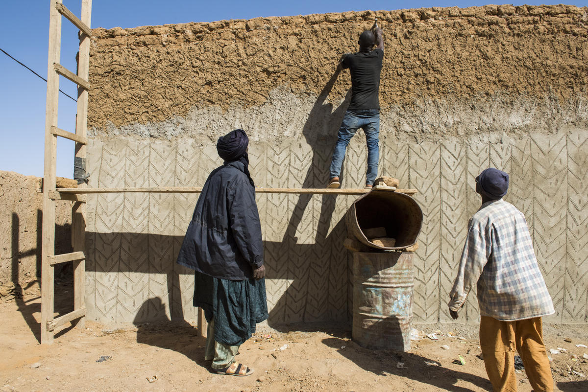 En février 2019, deux maçons ont ajouté une toute dernière couche de mortier aux murs de sa maison. Grâce au HCR et à l’UE, le travail des maçons a été subventionné avec un don de 25,000 CFA (€38). En 2018, 130 projets pour aider à la reconstruction de maisons de réfugiés ou de déplacés internes, qui étaient revenus à Gao, ont été financés par le HCR et l’UE.