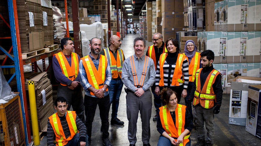 Jim Estill, PDG de 'Danby Appliance' (au centre), avec des travailleurs syriens dans l'entrepôt de son entreprise au Canada.