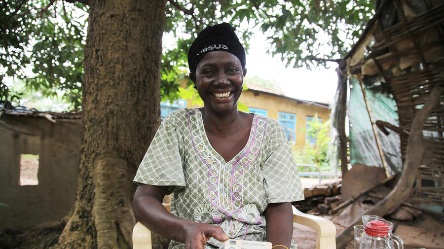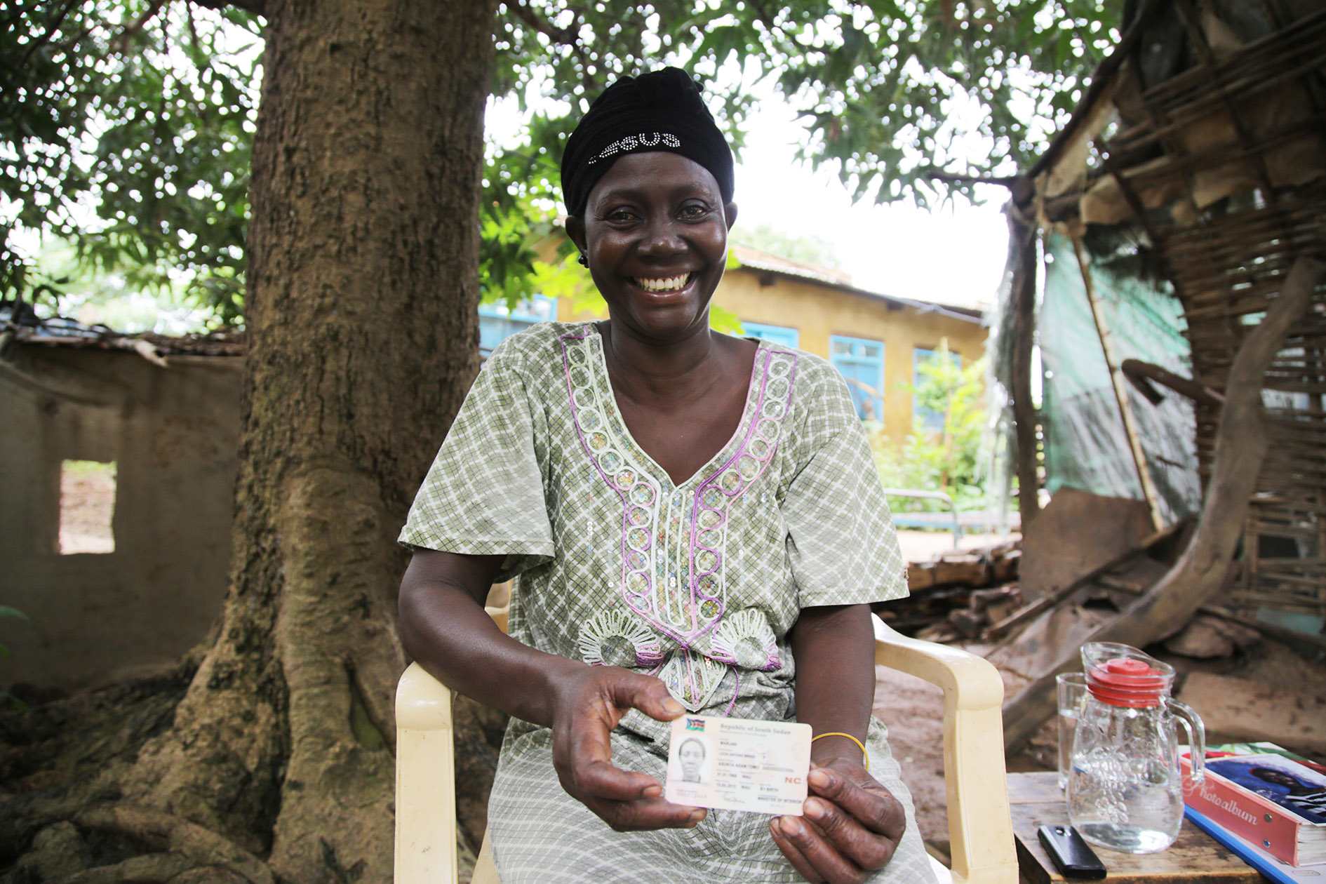 Lucia Tomo, 47 ans, sourit en présentant sa carte d'identité nationale à Wau, au Soudan du Sud.
