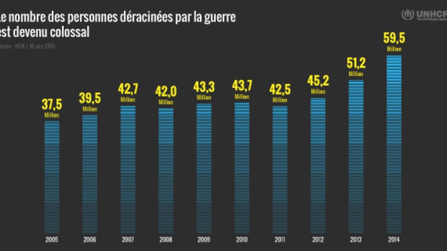 Le tout dernier Rapport du HCR sur les Tendances mondiales, publié jeudi, fait état d'une hausse considérable du nombre de personnes forcées à fuir, avec 59,5 millions de déracinés à la fin 2014 en comparaison de 51,2 millions l'année précédente et 37,5 millions il y a une décennie. L'augmentation depuis 2013 est la plus importante jamais enregistrée en une seule année.