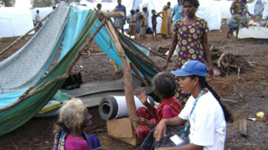 A l'oeuvre dans les zones les plus dangereuses de la planète: Un membre du personnel du HCR interview une femme qui a fui cette année les derniers combats de la guerre civile au Sri Lanka.
