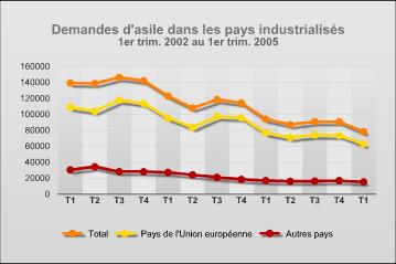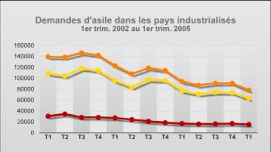 Le porte-parole de l'UNHCR, Ron Redmond, a présenté à la presse, ce vendredi, à Genève, les statistiques du premier trimestre 2005 dans 36 pays industrialisés. Il a expliqué que le total de 81 900 demandes d'asile, entre janvier et mars 2005, représentait une diminution de 13 pour cent par rapport au dernier trimestre de 2004, et de 17 pour cent par rapport aux trois premiers mois de l'année dernière.